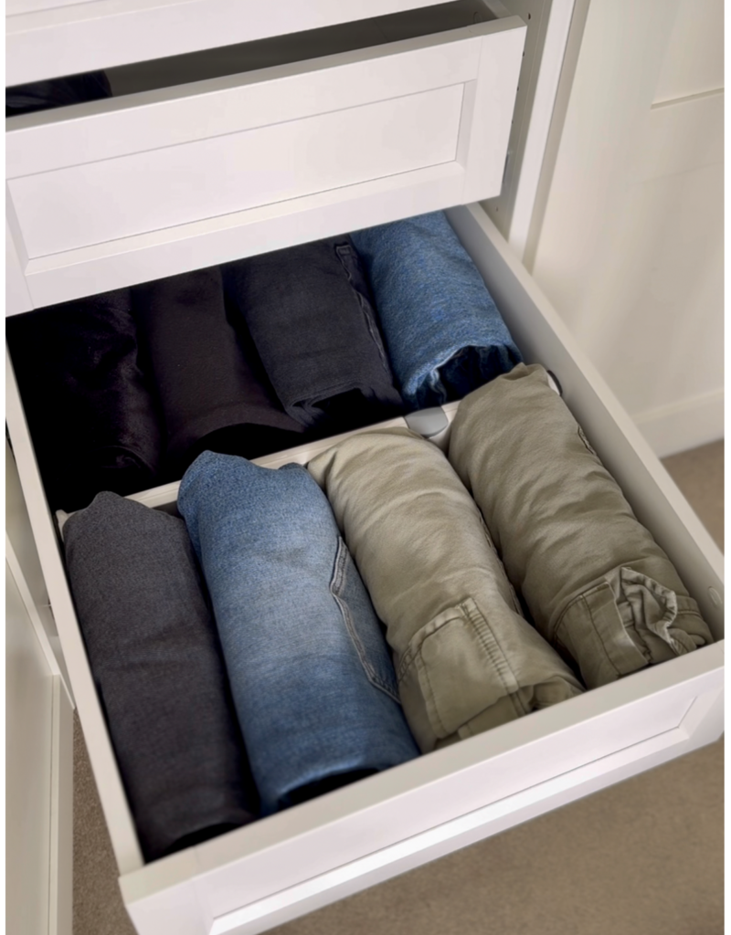 If your drawers are deep make sure you keep your most worn jeans to the front for easy access. And don’t forget your most worn may change from season to season so it’s perfectly normal to have a RESET.