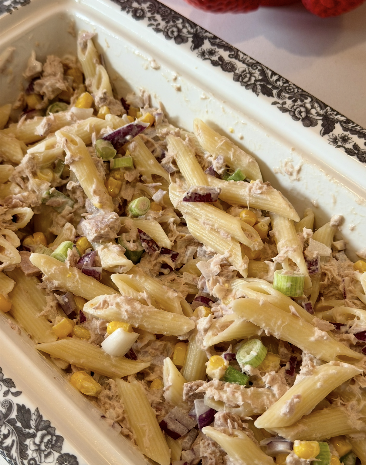 The ingredients I used were already in my fridge, but you can easily add peppers or any of your favourite salad vegetables. I like to use penne pasta, though any shape works well. Farfalle (bow ties) looks particularly nice if you’re making it for guests at a barbecue. Add mayonnaise to taste, along with more or less tuna depending on your preference, it’s also such an easy recipe to adjust to suit your tastes.